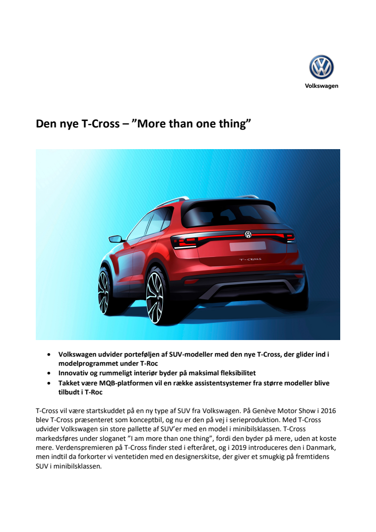 T-Cross vil være startskuddet på en ny type af SUV fra Volkswagen. På Genève Motor Show i 2016 blev T-Cross præsenteret som konceptbil, og nu er den på vej i serieproduktion. Med T-Cross udvider Volkswagen sin store portefølje af SUV’er med en model i minibilsklassen.