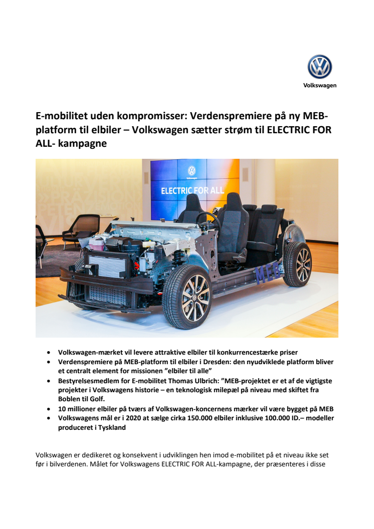 E-mobilitet uden kompromisser: Verdenspremiere på ny MEB-platform til elbiler – Volkswagen sætter strøm til ELECTRIC FOR ALL- kampagne