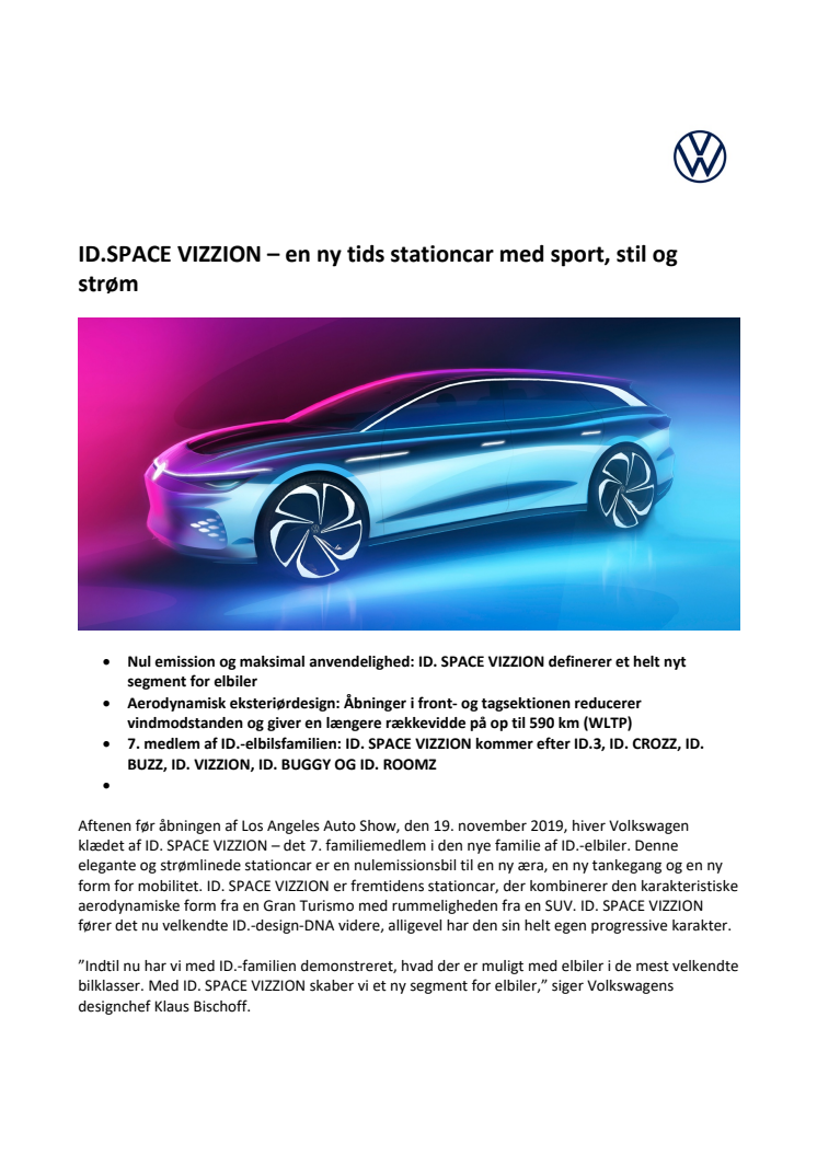 Aftenen før åbningen af Los Angeles Auto Show, den 19. november 2019, hiver Volkswagen klædet af ID. SPACE VIZZION – det 7. familiemedlem i den nye familie af ID.-elbiler. Denne elegante og strømlinede stationcar er en nulemissionsbil til en ny æra, en ny tankegang og en ny form for mobilitet.