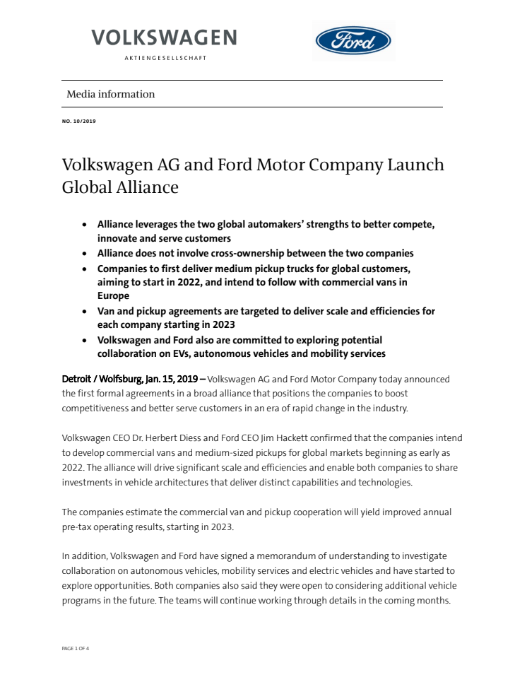 Volkswagen AG and Ford Motor Company today announced the first formal agreements in a broad alliance that positions the companies to boost competitiveness and better serve customers in an era of rapid change in the industry.