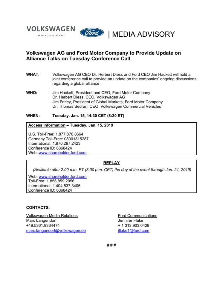 Volkswagen AG and Ford Motor Company to Provide Update on Alliance Talks on Tuesday Conference Call