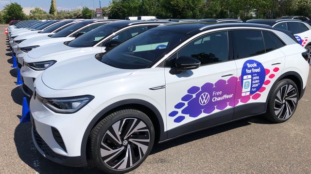 Et af disse transportmidler er shuttleservicen ”Volkswagen Free Chauffeur“, som på grund af pandemien kun kører i København og München. Der har fansene mulighed for at blive transporteret emissionsfrit i et fastlagt område i en ID.3 eller ID.4.