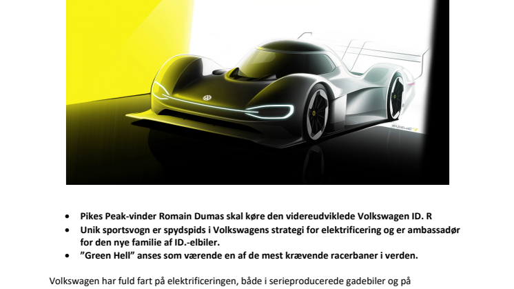 ID. R, der videreudvikles til rekordforsøget på Nürburgring, kører med to elmotorer med en samlet systemydelse på 500 kW (680 hk), og den vejer mindre 1.100 kg. inklusiv racerkører. ”Først og fremmest vil vi ændre aerodynamikken på ID.R og tilpasse den forholdene på Nürburgring Nordschleife, der er markant anderledes end Pikes Peak,” siger François-Xavier Demaison, der er teknisk direktør hos Volkswagen Motorsport. I modsætning til det klassiske Pikes Peak-løb, der starter i en højde på 2.862 meter og ender i 4.302 meters højde, snor Nürburgring Nordschleife-banen sig gennem Eifel-bakkerne i højde på mellem 320 og 617 meter over havets overflade. Den ikoniske bane har en helt unik karakteristik, ikke mindst på grund af den lange Döttinger Höhe-langside. “Som en del af vores grundige forberedelser til rekordforsøget, vil vi sende ID. R gennem et intensivt test- og udviklingsprogram på forskellige baner i løbet af foråret, “ tilføjer Demaison. Rekordforsøget på Nürburgring er planlagt til at finde sted i løbet af sommeren.